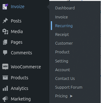 The first thing you have to do is access the Invoize > Recurring menu on your WordPress sidebar.
