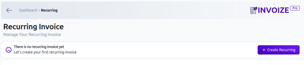 To start creating a recurring invoice, you need to press the + Create Recurring button. You can find the button on the top right.