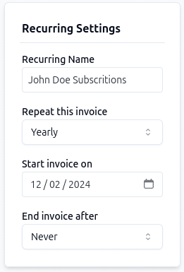 Make settings in the Recurring Settings section according to the transaction you want to create an invoice for.