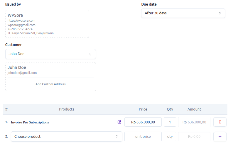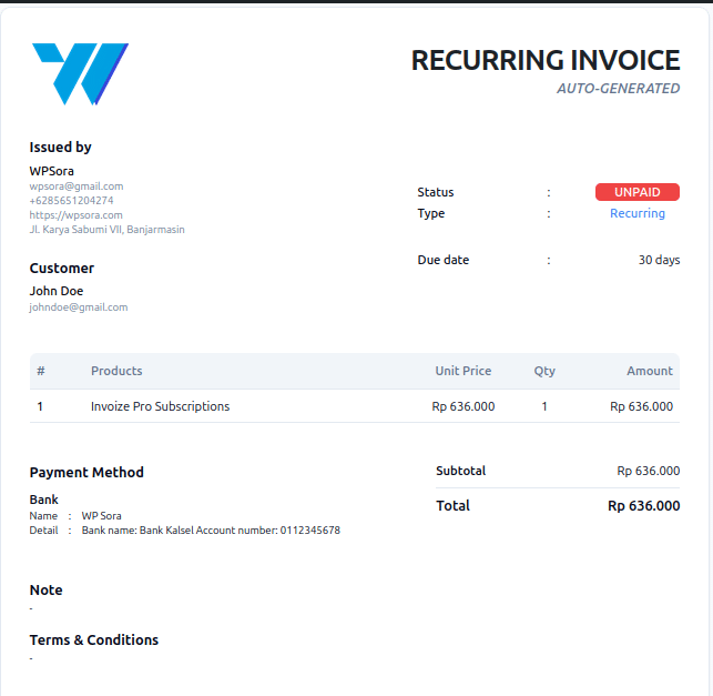 Invoize consists of 2 versions, a free version and a paid version (Pro Version). You are required to use the Pro Version of the Invoize plugin to be able to use the recurring invoice feature. To find out more you can visit the WP Sora home page.