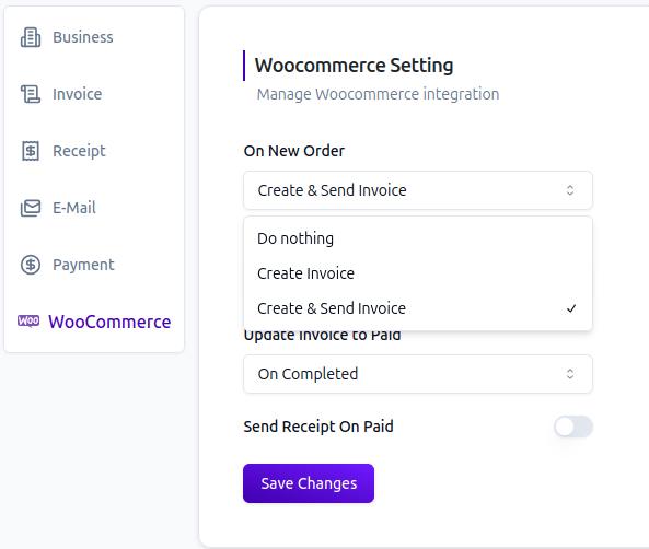You can choose Create Invoice or Create & Send Invoice in the On New Order setting.